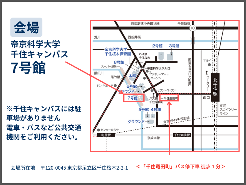 ※千住キャンパスには駐車場がありませんので、電車・バスなど公共交通機関をご利用ください。